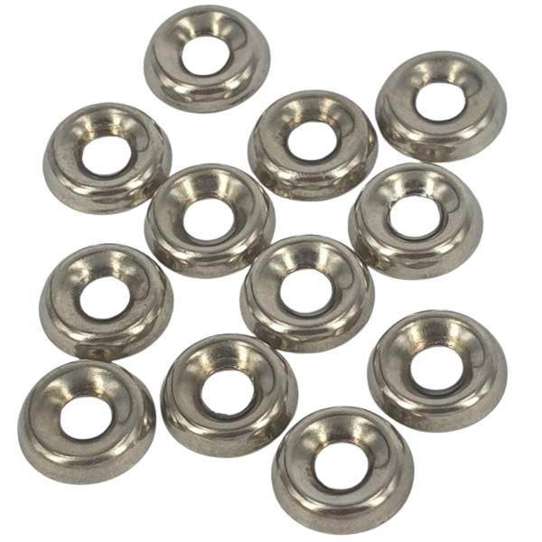 Cup Washer – Nickle Plated also called a trim or finishing washer, has an increased bearing surface and the cupped design gives a clean finished appearance. It is round with a hole in the middle and can dress up a project while mostly hiding the appearance of the screw. The washer is designed for use with flat or oval head screws. The size designates the inner diameter of the washer and should match the screw diameter being used.